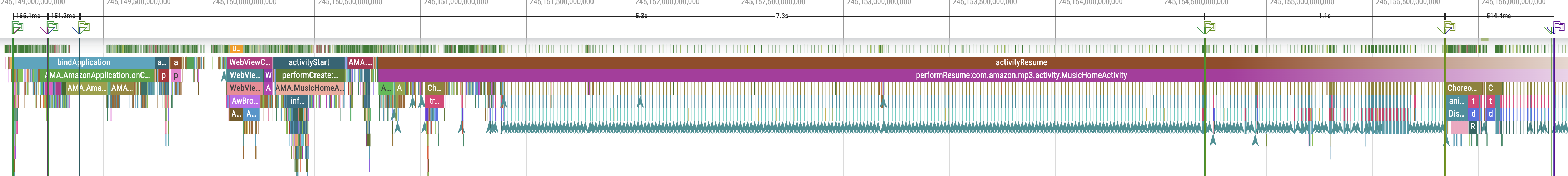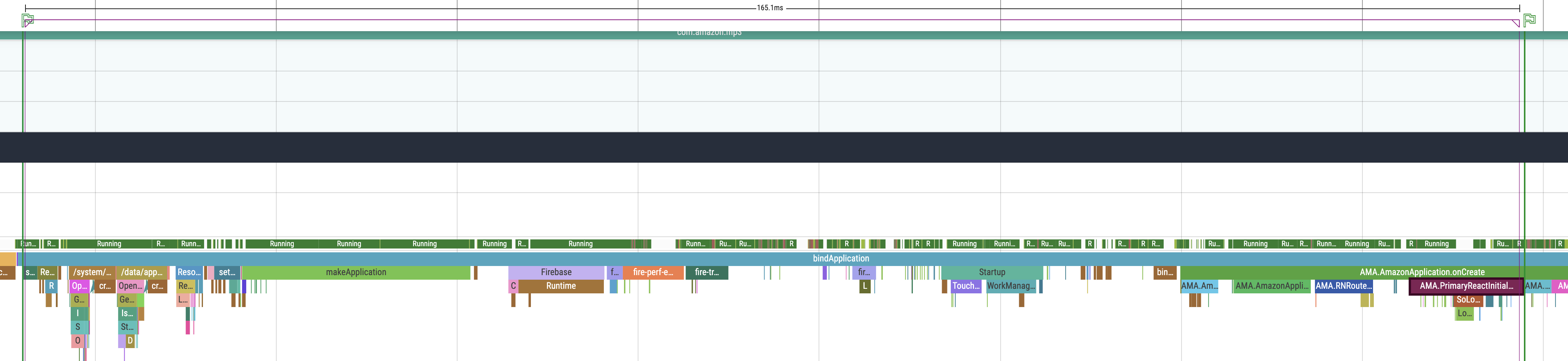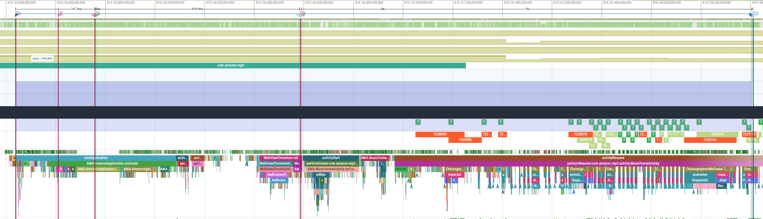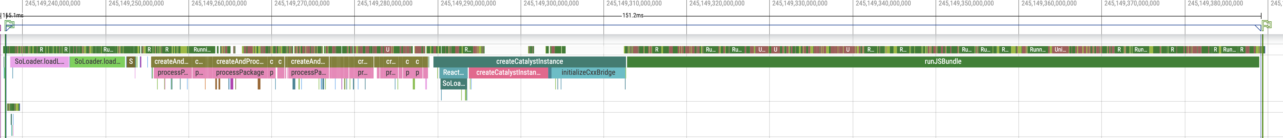 Here’s a screenshot of the end-to-end cold start latency collected via Systrace using a Pixel 3A device and app built in release mode. The trace is available here pixel_3a_rn_cold_start.perfetto-trace: