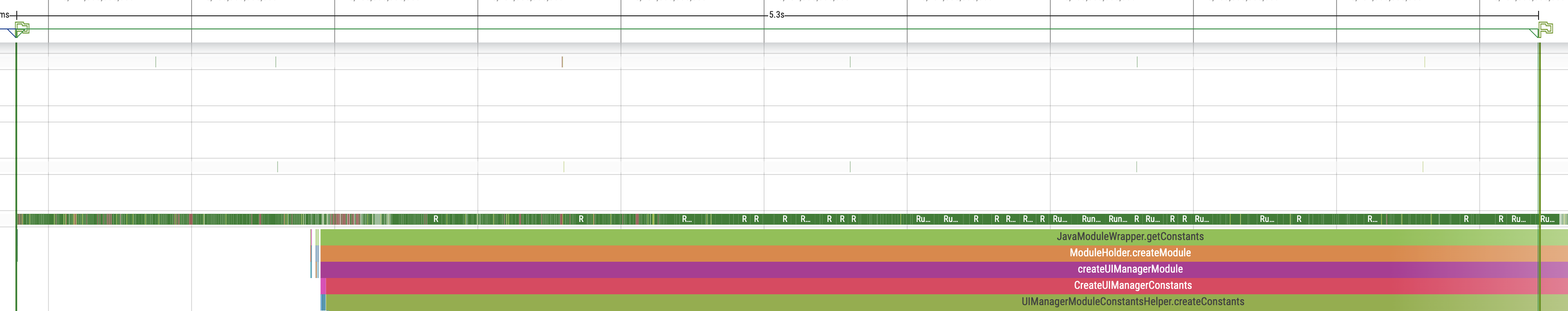 Following the mqt_js initialization the native modules gets initialized on the mqt_native_modules thread. At the end of this, taking roughly 1s, a callback onBatchCompleteUI is invoked which will trigger rendering.
