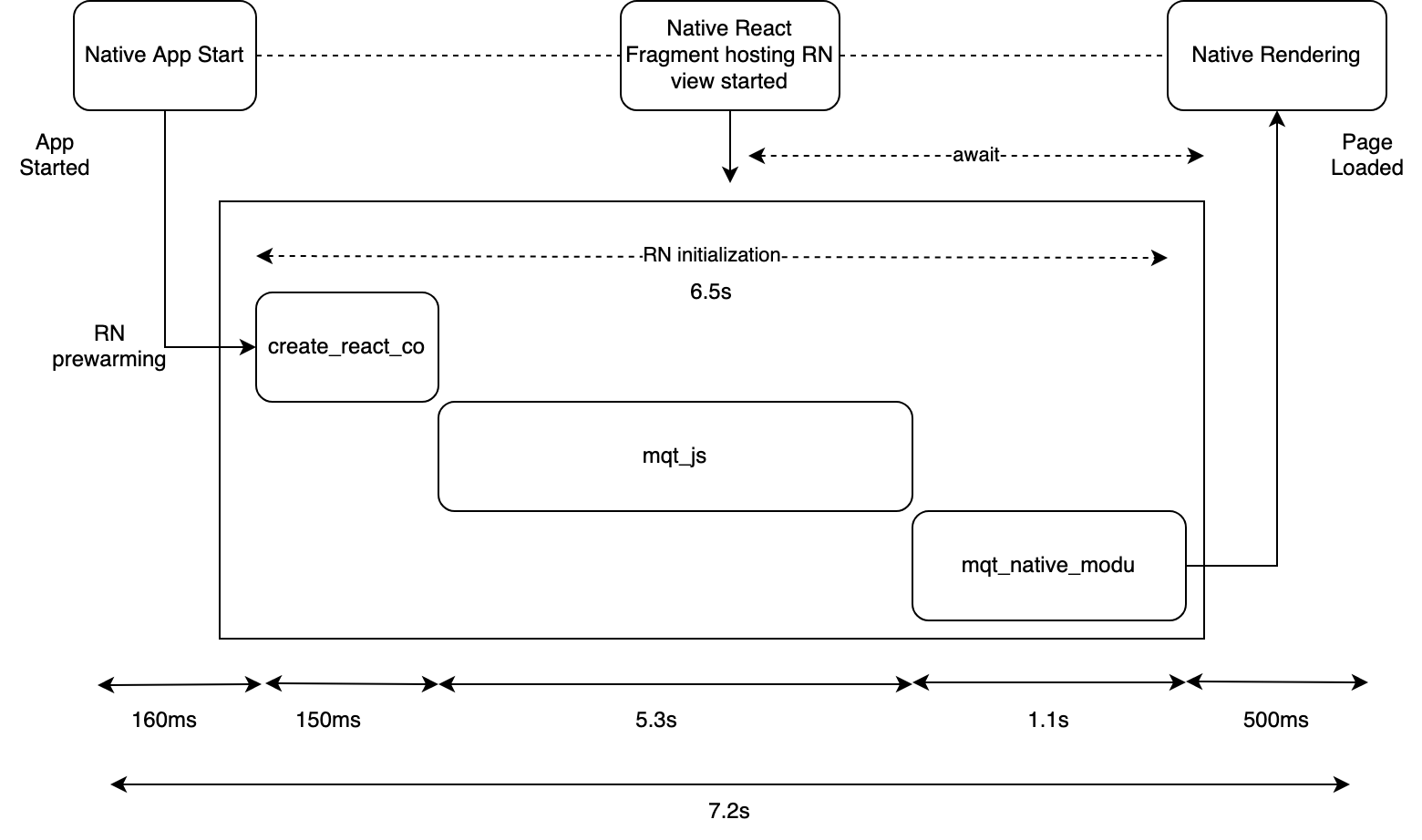 Data collected after FLP Experiment Weblab Latency Analysis Android: Find Page CX on React Native Experiment Writeup [DRAFT] suggested the experience with React Native enabled (T1) has worsened cold start performance compared to its Native counterpart (C). Specifically, the performance has worsened 3.6x at P90 (5.7s vs 1.5s) where the major contributor is from the “start” leg (1800ms vs 86ms). The “start” leg corresponds to the timing between the Native initialization of React Native until JS from the RN bundle is executed.